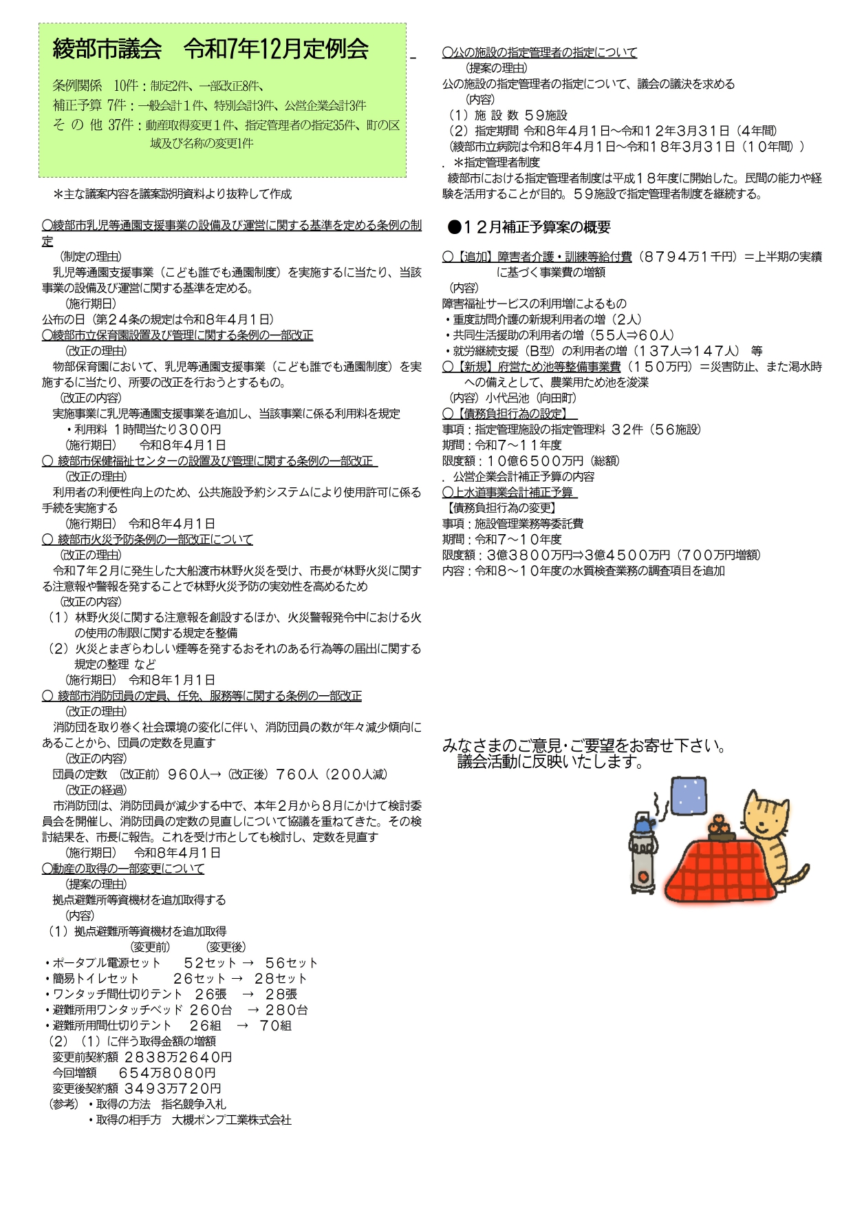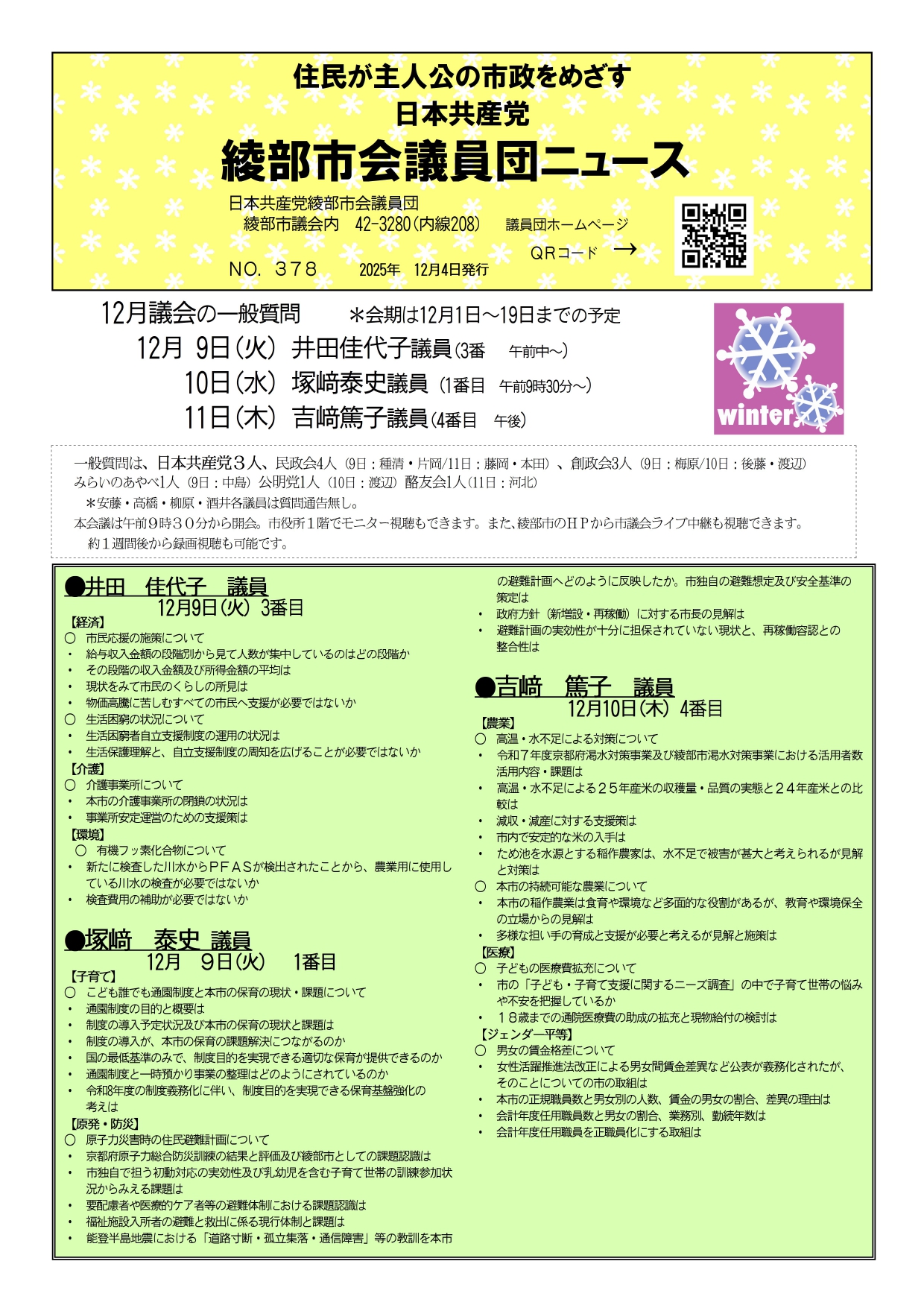 議員団ニュース(2025/12/4)を掲載しました 2025-12-03 最終更新日時 : 2025-12-03 master 議会報告「こんにちは 日本共産党市会議員団です」 & 議員団ニュース履歴分はこちら FacebookXBlueskyHatenaCopy