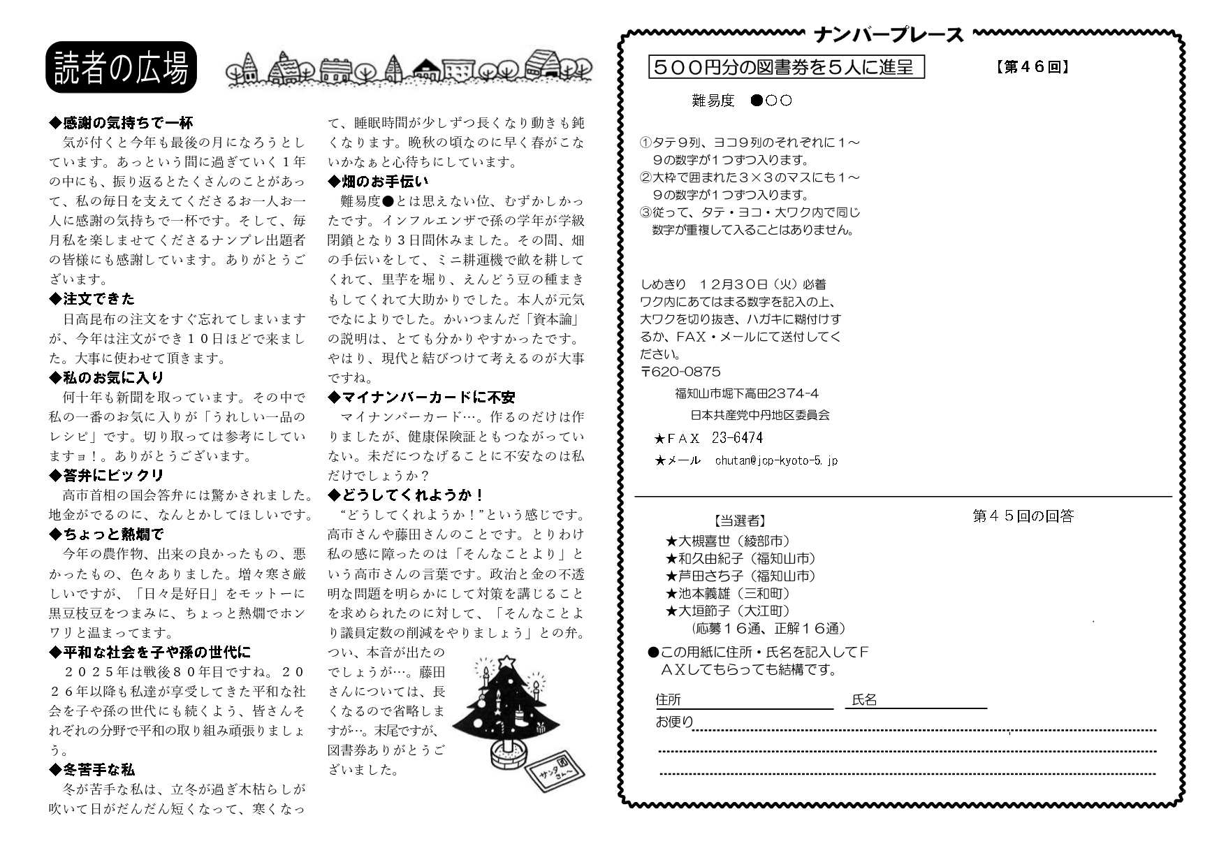 「赤旗」読者ニュース 2025年12月号 2025-12-21 最終更新日時 : 2025-12-21 master 「読者ニュース」(赤旗日曜版12/21号に折り込み)掲載しました。 FacebookXBlueskyHatenaCopy